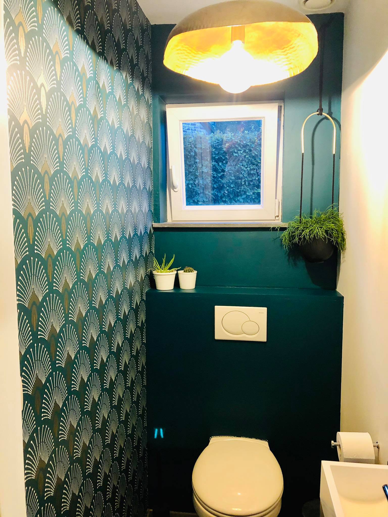 Premièrement, le point de départ était la couleur vert foncé. Nous optons alors pour une décoration avec une touche de glamour et de vintage grâce à ce superbe papier peint et les rappels de doré sur la suspension et la plante.
